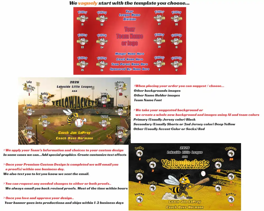 Includes Banner and Finish Style ~ either Grommets (metallic holes for clips or ropes) or Pole Pockets (for poles and frame) Full color, photographic quality that does not fade outdoors! Fast and easy setup/take down.